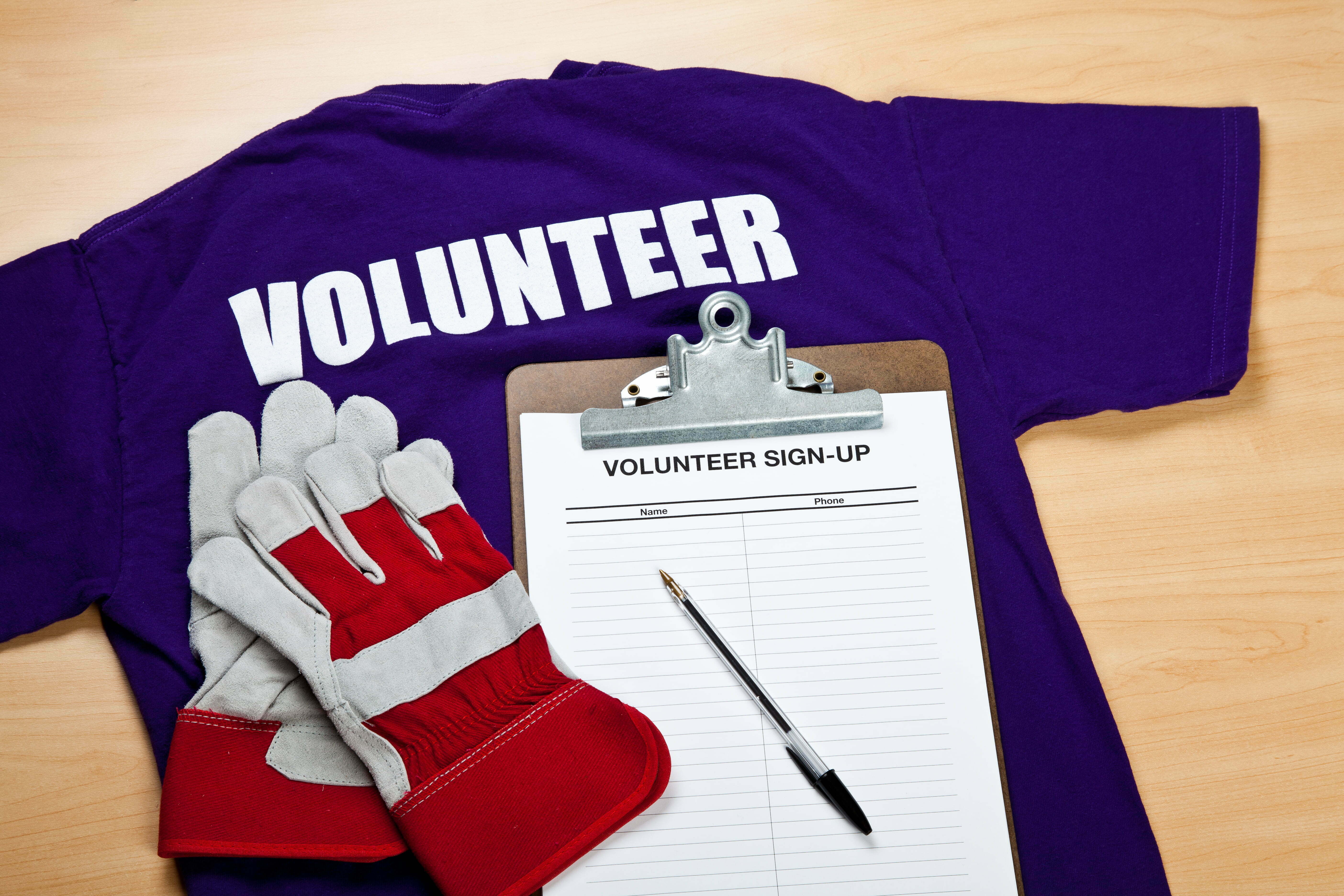 Blank volunteer sign-up sheet on a clipboard waiting for people to put their name and phone down to volunteer. Clipboard placed on a t-shirt that says volunteer and a pair of work gloves.